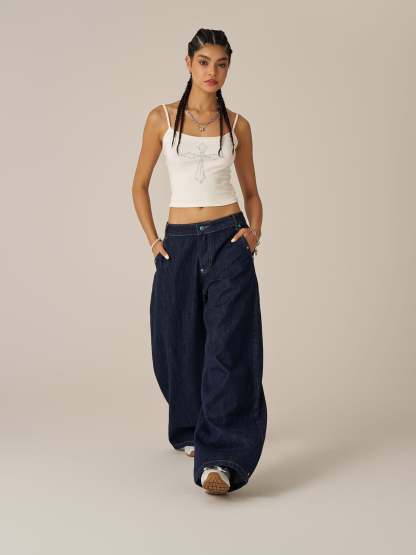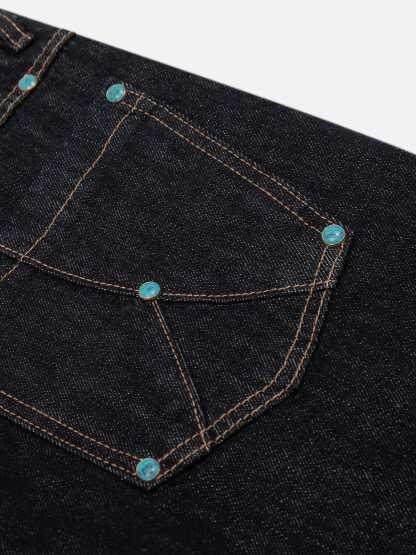 These baaggy jeans blend retro vibes with modern street style. Designed with a curved barrel cut, contrast stitching, and bold turquoise-brass rivets, they serve up standout details with a touch of attitude. Each rivet is ultra-durable, secured using a method tested to withstand over 1,000 machine washes. The relaxed fit keeps things easy and versatile. Made for skaters, festivals, and everyday flex—throw them on with anything and still look fire.