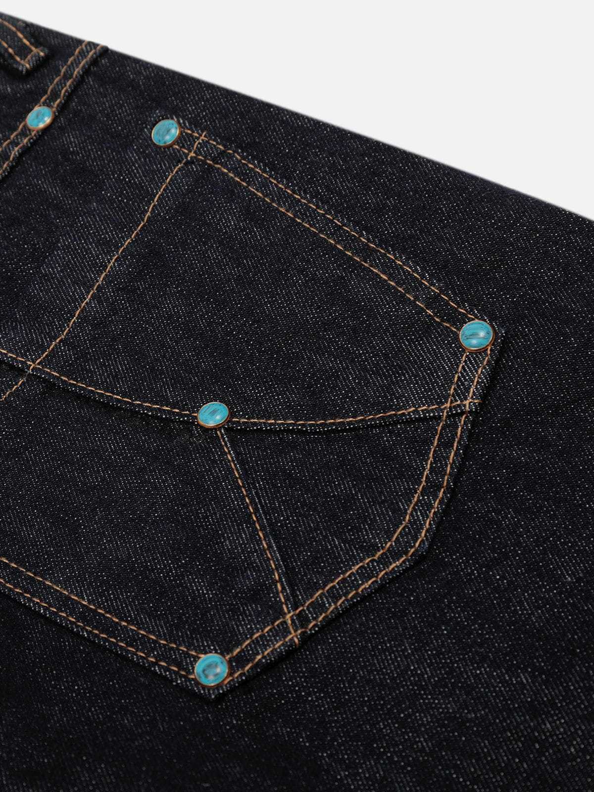 Clothing details: Turquoise-cyan Rivets; Contrast Stitching.