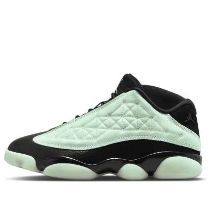 The Air Jordan 13 Retro Low 'Singles Day' is the perfect sneaker to celebrate the commercial holiday. This sneaker features a black tumbled leather vamp, black synthetic suede paneling, and pale green leather overlays. The geometric stitch detailing on the lateral side is glow-in-the-dark, while the medial side features a luminescent Air Jordan 0023 and 1111 Low. The green accents on the tongue and outsole are also glow-in-the-dark, making this sneaker perfect for any holiday celebration.