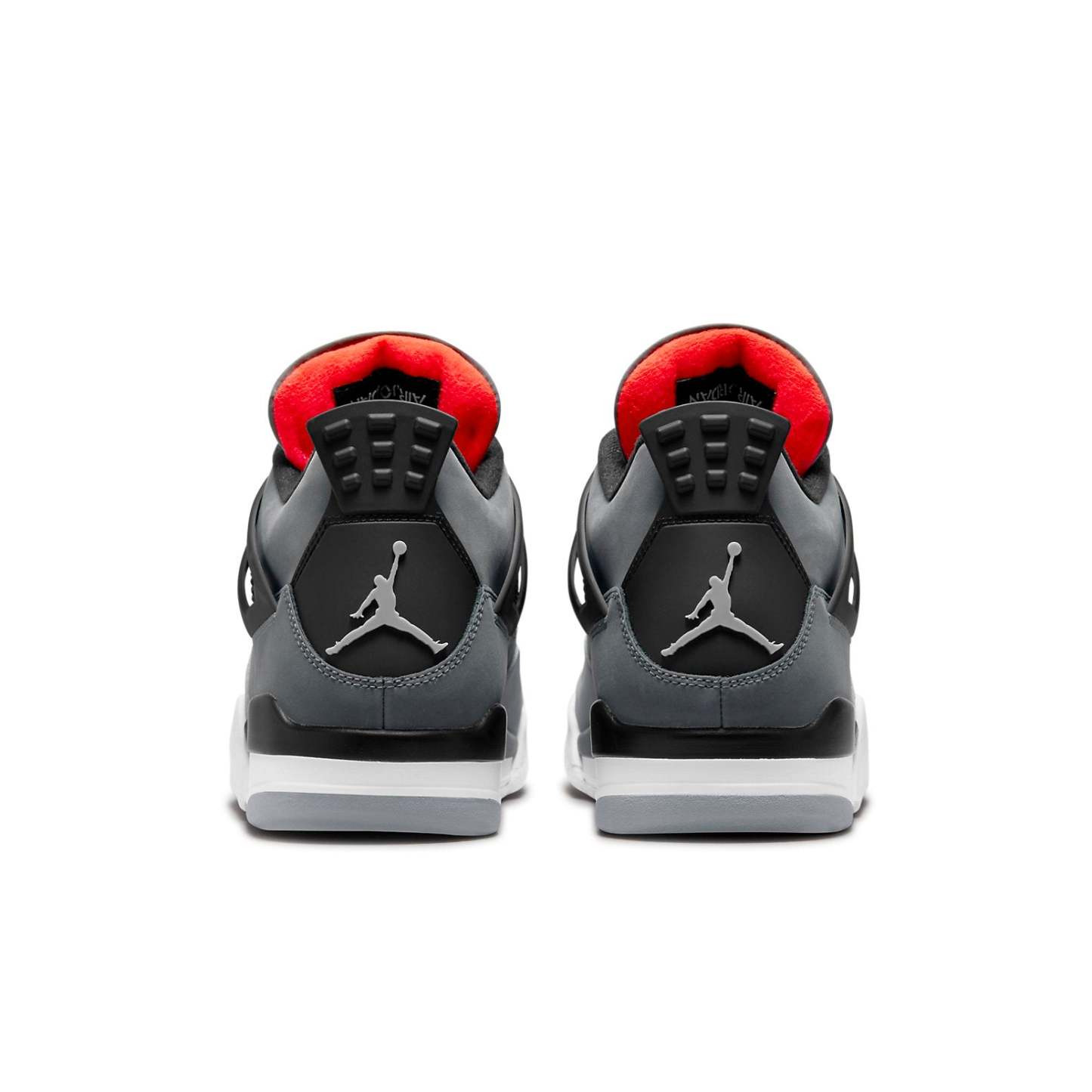 The Nike Air Jordan 4 Retro 'Infrared' provides a unique take on the classic AJ4 silhouette. The upper is crafted from smooth nubuck in a charcoal finish with a lighter shade of grey distinguishing the forefoot overlay. Black accents complete the look of the sneaker, while the titular hue lights up the woven tongue tag and a quartet of molded eyelets. A polyurethane midsole ensures a smooth ride, thanks to visible Air-sole cushioning in the heel. Whether you're a sneakerhead or casual fan of the Air Jordan line, this retro sneaker is a must-have for your collection.