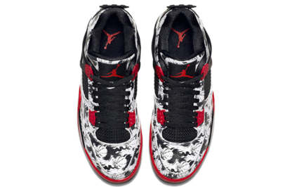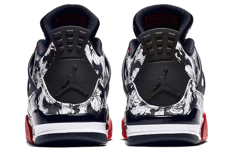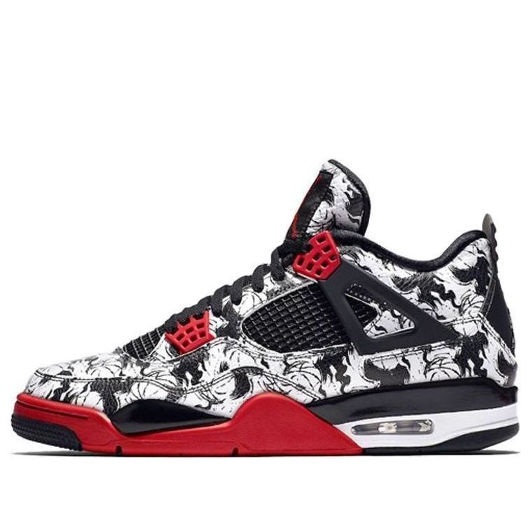 Take flight in the iconic Air Jordan 4 Retro. This classic shoe was first released in 1989 and was designed for high-performance on the basketball court. The Air Jordan 4 Retro 'Tattoo' features a leather upper covered in a black-and-white basketball print, with contrasting pops of Fire Red on the molded eyelets and outsole. The Bulls-inspired color palette is finished with classic black on the structural wings, quarter-panel netting and Jumpman-embossed heel. Whether you're hitting the hardwood or just style-conscious, the Air Jordan 4 Retro 'Tattoo' is a must-have in your sneaker rotation.
