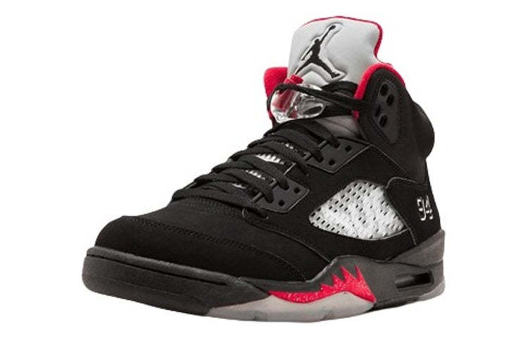 The Nike Supreme x Air Jordan 5 Retro 'Black' is a special edition sneaker that was released in October of 2015. This sneaker is part of a limited edition collaboration between Nike and Supreme, and features Supreme branding across the netting and the number ‘94’ on the heel representing the year Supreme was founded. The sneaker is made with high-quality materials and construction, and is designed for durability and style.
