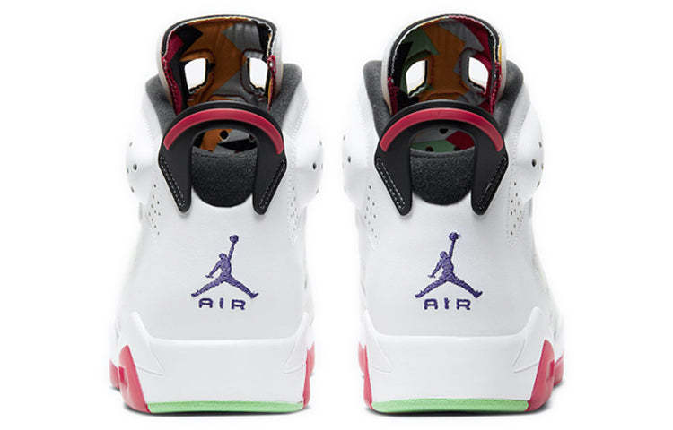 The Nike Air Jordan 6 Retro "Hare" revisits the iconic colorway of a previous release, featuring a white-and-gray main color scheme. Colorful details include the rubberized tongue and carrot themed lace.