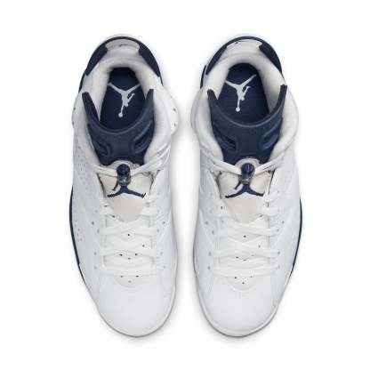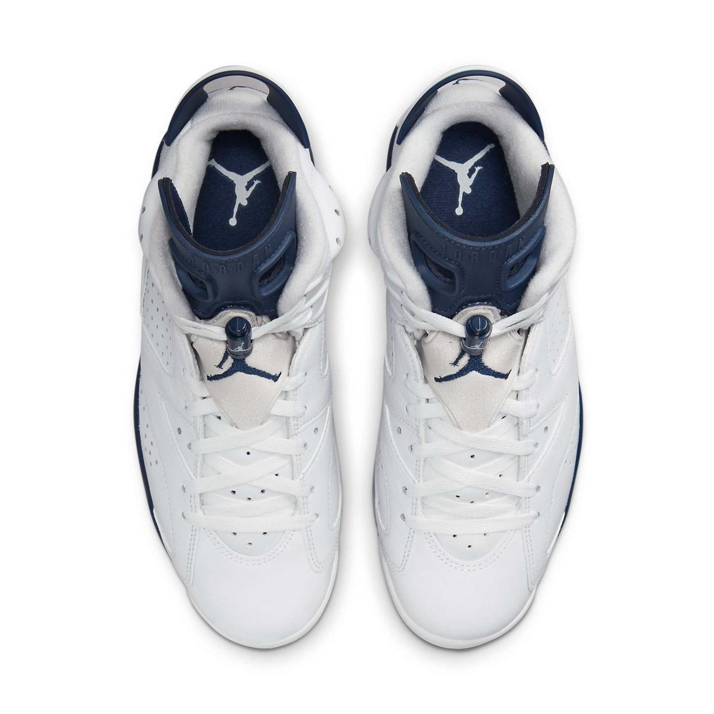The Air Jordan 6 Retro "Midnight Navy" 2022 is a classic colorway first seen in October 2000. It pairs a white leather upper with Midnight Navy hits on the molded tongue and heel tab. The color repeats on the Jumpman-branded lace lock, textile lace guard and back heel. The sneaker is mounted on a two-tone polyurethane midsole, fitted with an Air-sole unit in the heel. A translucent rubber outsole appears underfoot.