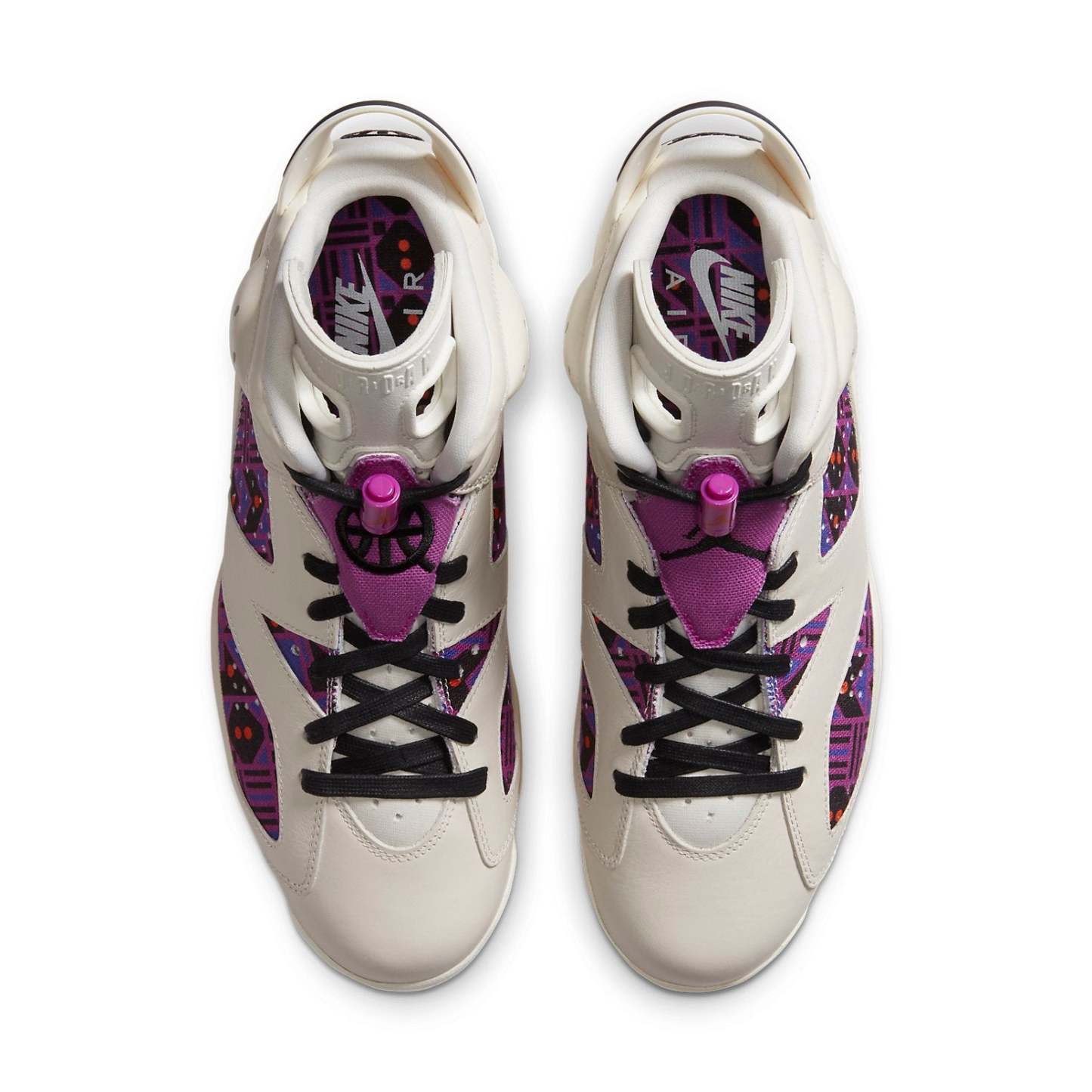 Nike Air Jordan 6 Retro Quai 54 comes constructed with premium leather and textile. It uses the same bold prints as its predecessors and a more colorful palette which mix of purples, oranges, and blues. The right shoe swaps the Quai 54 graphics on the throat overlay and the heel.