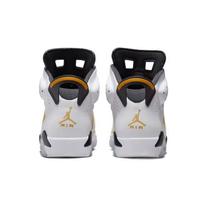 The Air Jordan 6 Retro 'Yellow Ochre' delivers a fresh take on the classic silhouette, featuring a vibrant yellow nubuck upper with white leather overlays. Perforations for breathability and a comfortable fit are complemented by a black and yellow neoprene lace cover and a visible Air unit in the heel. This iconic sneaker combines style and performance, making it a must-have for any Jordan enthusiast.