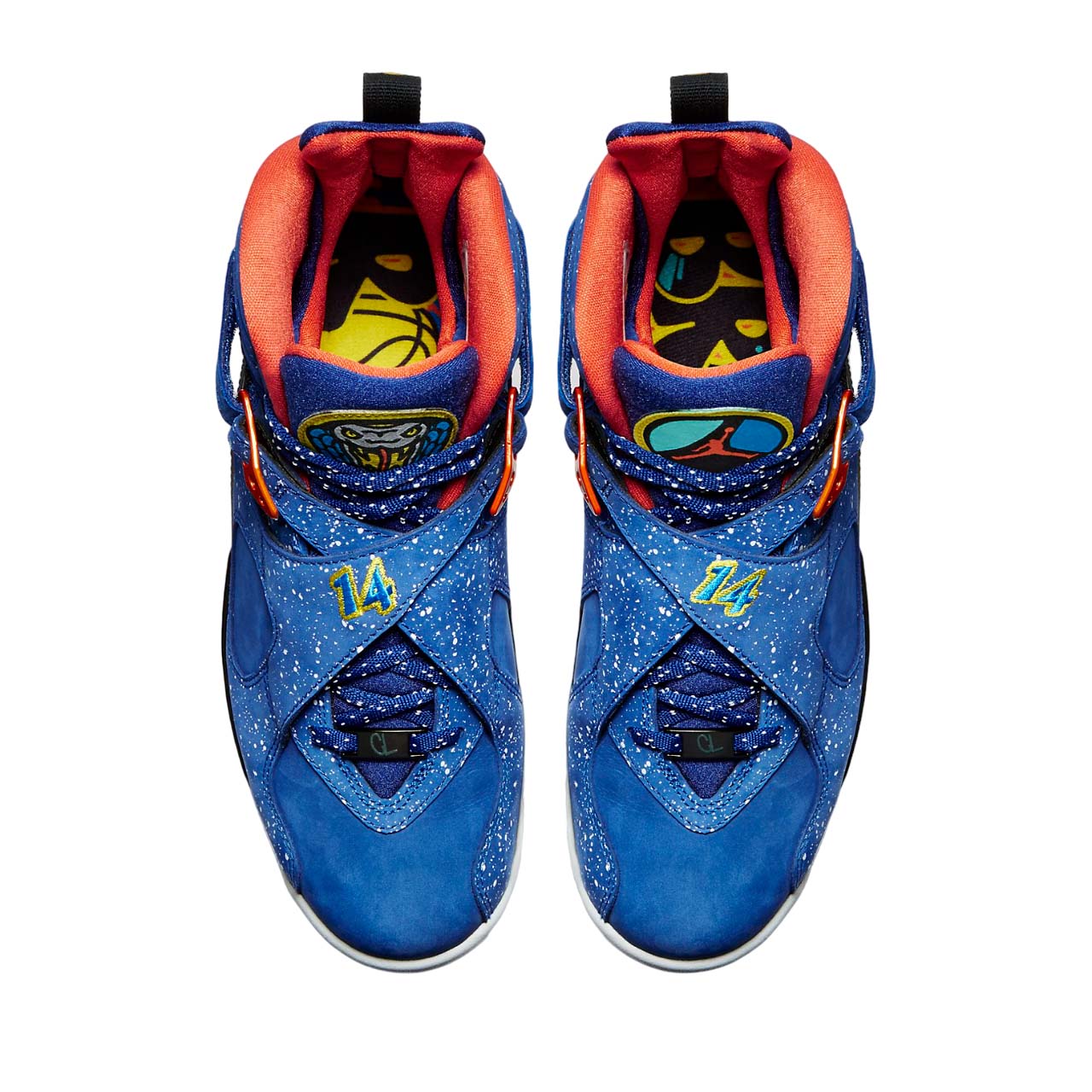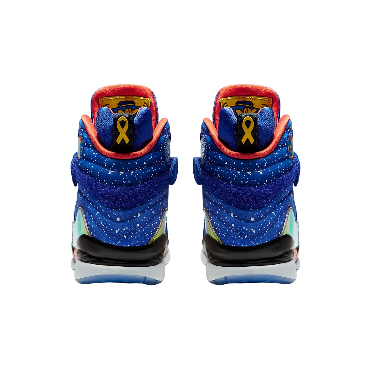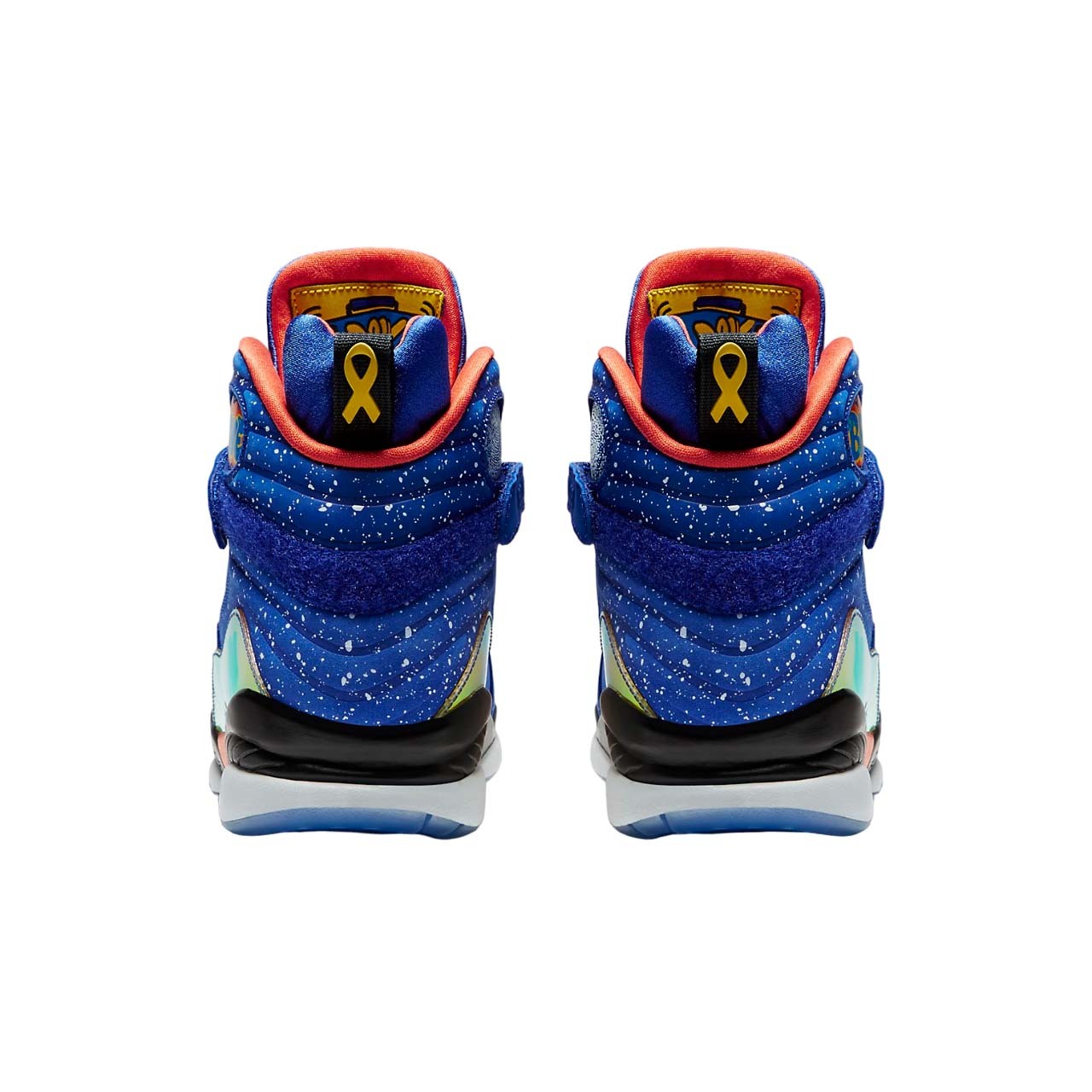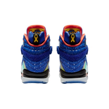 The Air Jordan 8 Retro DB 'Doernbecher' is a special edition sneaker designed by Caden Lampert, a young boy who battles with a life-threatening autoimmune disease known as Guillain-Barré syndrome. The vibrant sneaker features a Hyper Blue speckled upper with Electro Orange, Tour Yellow, and black accents. The sneaker also includes a raft of personal details. A keen basketball player, hits up the cross-strap, also included are a glow-in-the-dark fingerprint and the inspirational phrases 'Hang Loose,' Rock On,' and 'Brave.' This sneaker is not only stylish but also has a meaning behind it that is sure to inspire others.