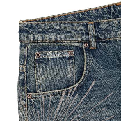 14,5oz denim / 100% cotton / embroidery on side / distressed all over with backing patches underneath (not see-through) / baggy fit
