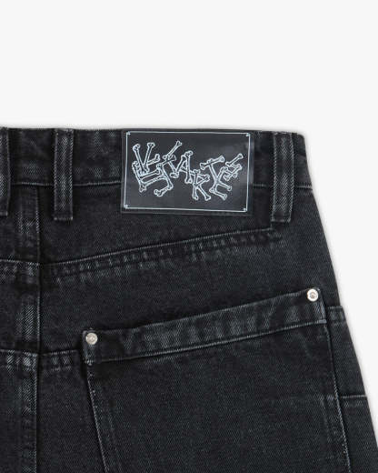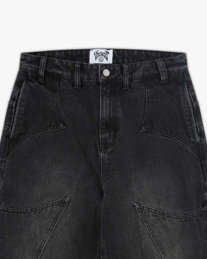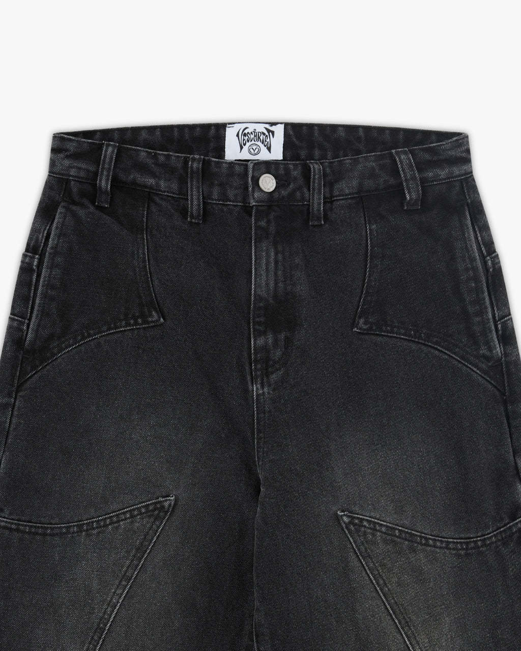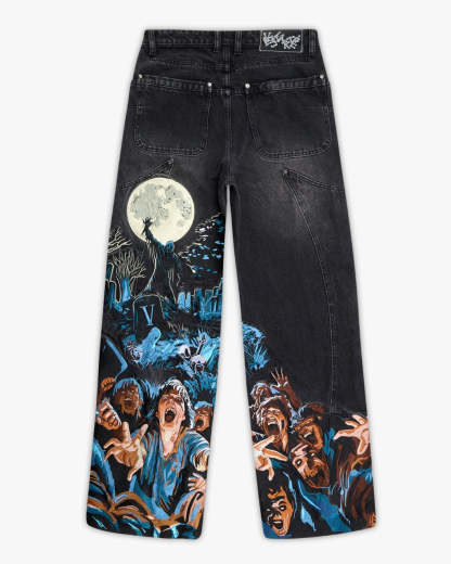 Crafted from a heavily washed black denim for a rugged, worn-in aesthetic. Massive full-leg back embroidery, depicting a haunting graveyard under a luminous full moon. Finished with a custom black leather patch spelling 'Vescartes' in bone lettering, this denim merges dark artistry with premium craftsmanship.