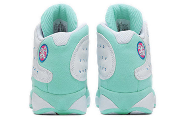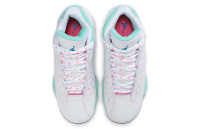 Nike Air Jordan Retro 13 GS Aurora Green Dressed in a white, soar, aurora green, and digital pink color scheme. This Air Jordan 13 features a white leather base with aurora green suede overlays and blue accents on the Jumpman tongue and outline of the signature hologram-styled ankle logo.