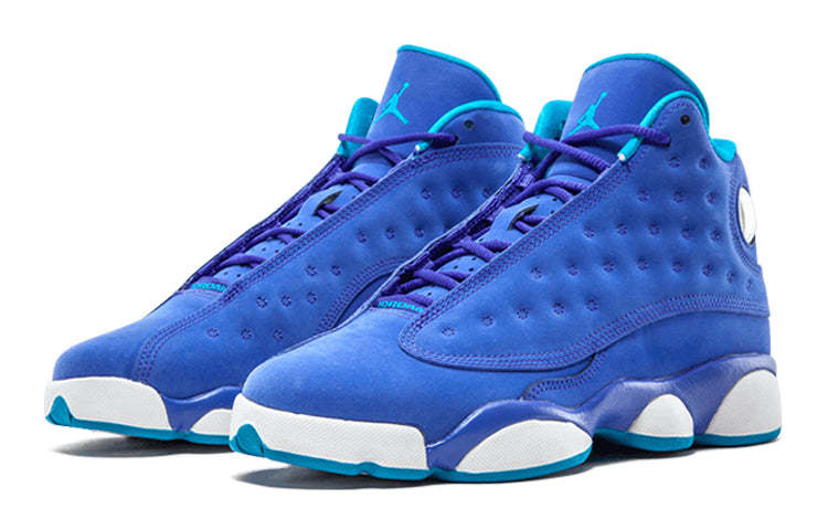 The Air Jordan 13 Retro 'Hornets' is a sleek and stylish sneaker perfect for any activity. Drawing inspiration from Michael Jordan's nickname "Black Cat" and his relentless drive to win, the shoe features a unique leopard-like pattern on the upper and a 3D hologram logo of the "Jumpman" on the side. The rubber sole provides superior cushioning and flexibility, while the bold design mimics the agility of a black panther. The colorway of Court Purple/Blue Lagoon-White is inspired by the Charlotte Hornets, making this sneaker a must-have for any fan.
