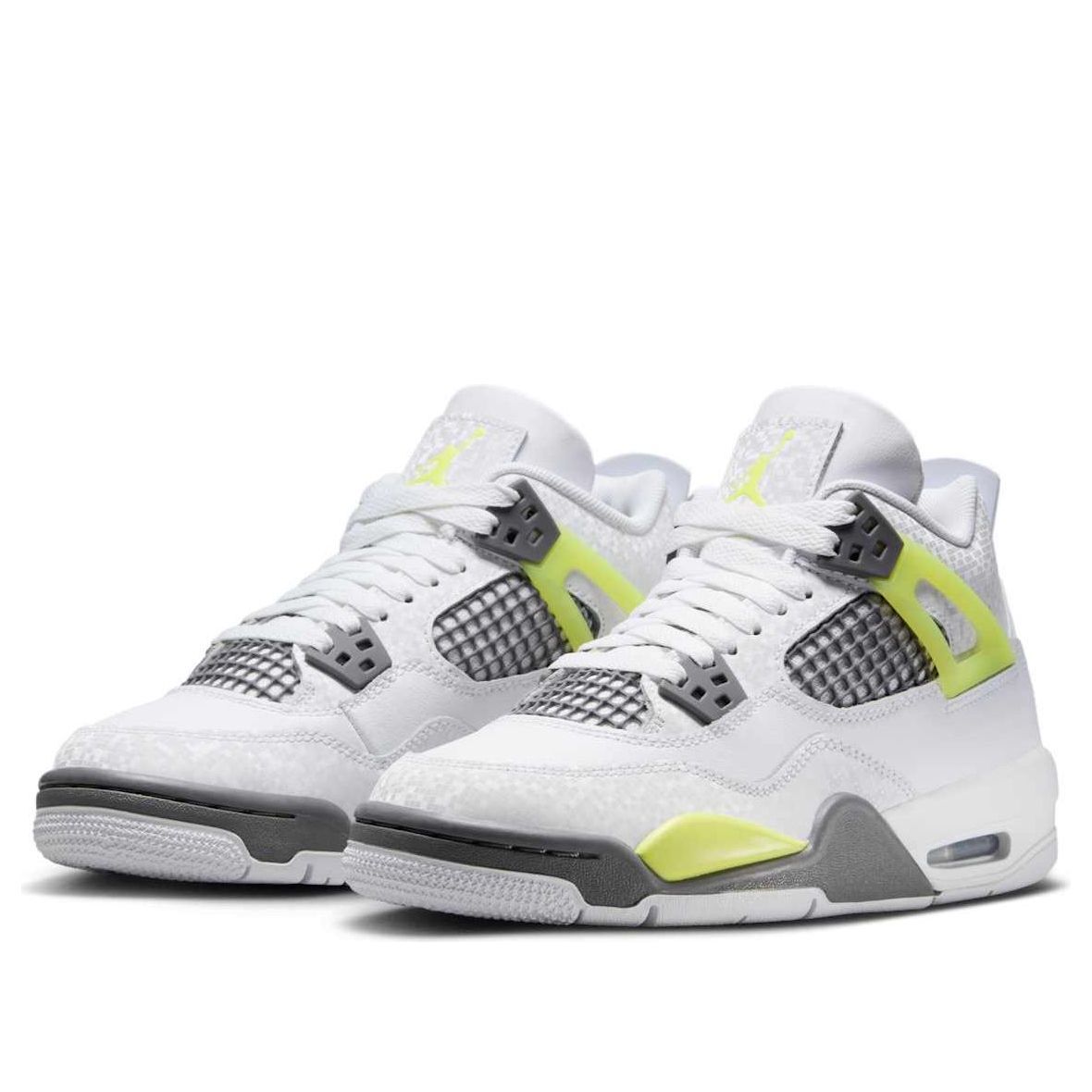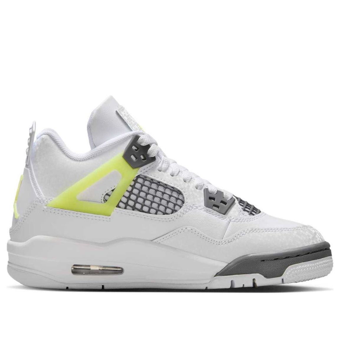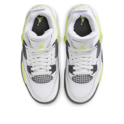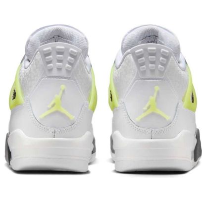 Fresh Air Jordan 4 GS in white and light lemon twist. Classic design meets vibrant color for a stylish, comfortable sneaker. Perfect for kids, featuring Air cushioning and durable outsole. A playful twist on a timeless icon.