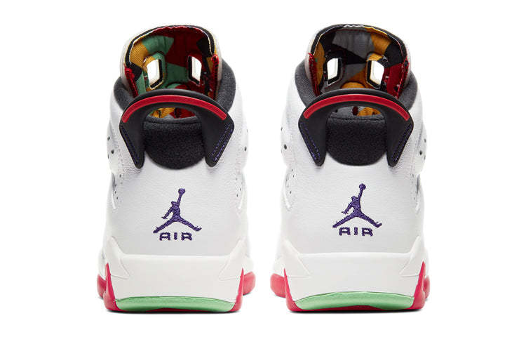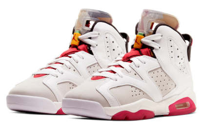 The Nike Air Jordan 6 Retro "Hare" revisits the iconic colorway of a previous release, featuring a white-and-gray main color scheme. Colorful details include the rubberized tongue and carrot themed lace. Now available in children's sizes.