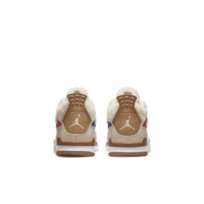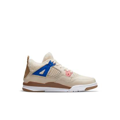Made for little kids, the Air Jordan 4 PS ‘Wild Things’ adds warm fleece construction to the padded collar and tongue, the latter accented with an embroidered Jumpman icon. The rest of the upper is built with tan leather and a quartet of color-popped eyelets in neon green, pink, blue and red. A second Jumpman logo embellishes a molded heel panel in dark beige. The sneaker sits on a two-tone foam midsole, supported by an outsole built with gum rubber under the forefoot and heel.
