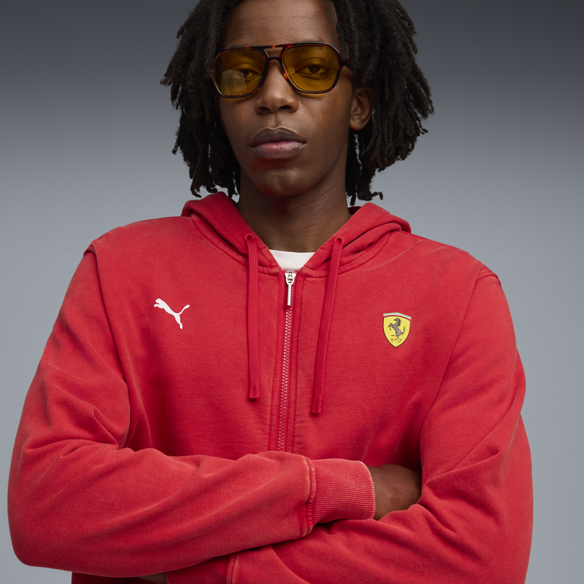 The PUMA and Scuderia Ferrari collection celebrates motorsport excellence and Ferrari's legendary racing heritage. This line of shoes, clothing, and accessories blends style, comfort, and performance with iconic Scuderia Ferrari colors and details, letting you carry the Ferrari legacy wherever you go.