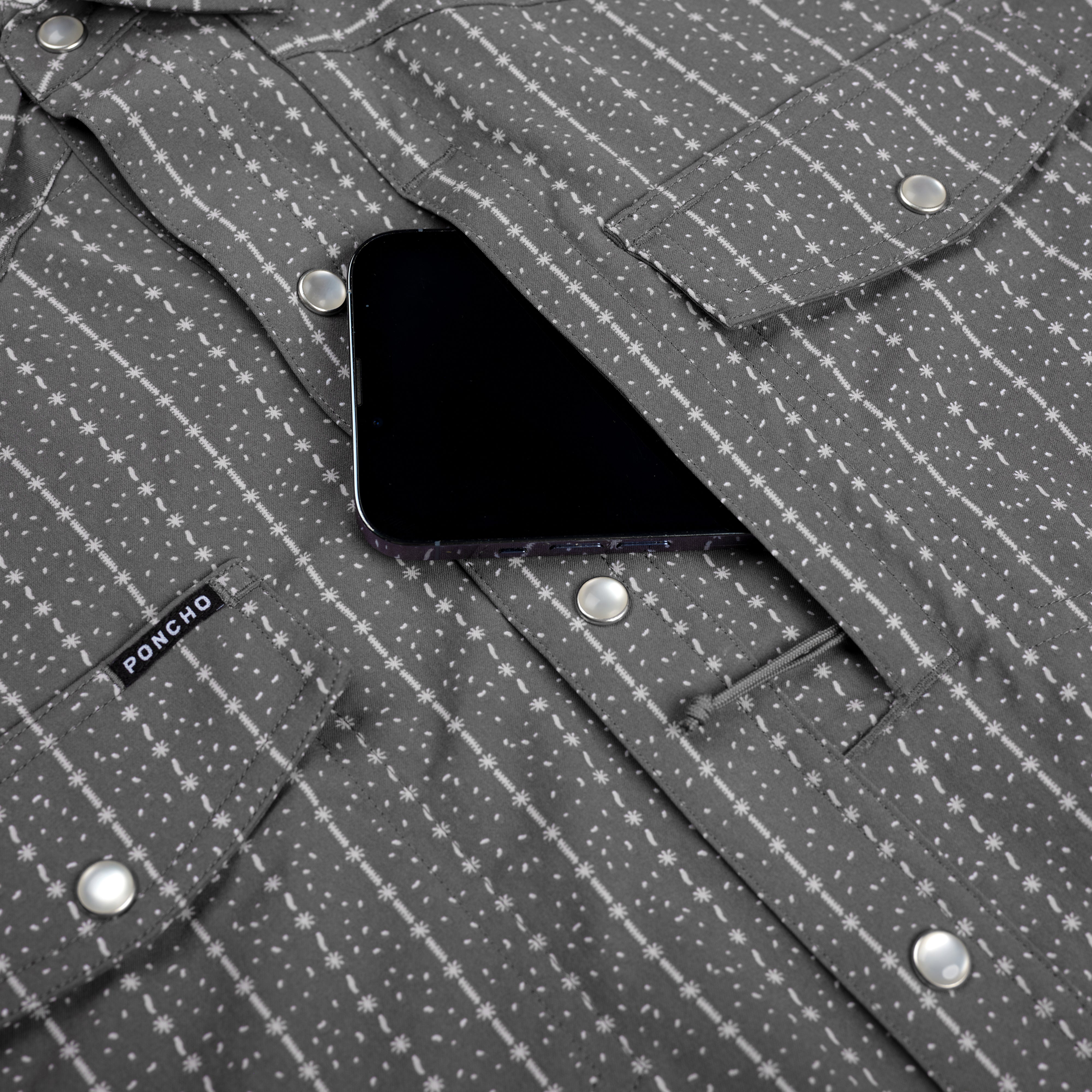 Our classic western shirts are made with the same breathable, lightweight, and quick-drying fabric you love from Poncho, so you’ll be comfortable until the cows come home. It’s got built-in sun-protection and tons of functional details to help while you’re working up a sweat. Plus, we’ve added pearl snaps and western styling, so you’ll be fit for any frontier.