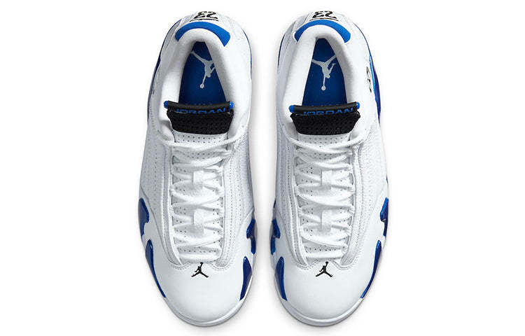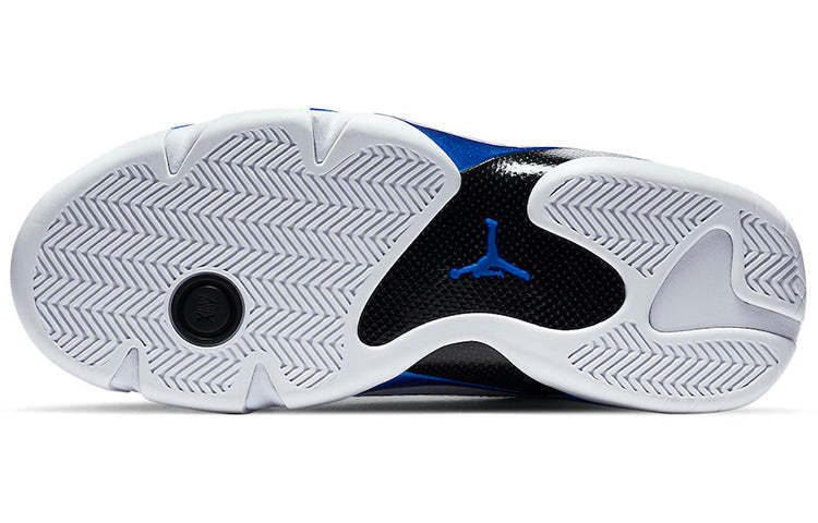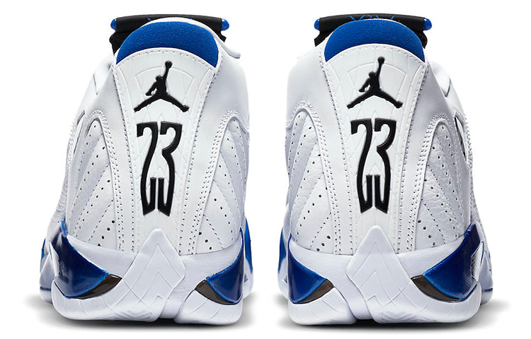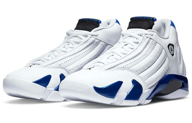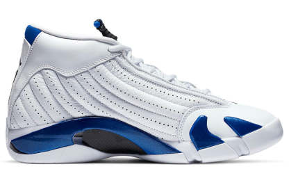 The slick Nike Air Jordan 14 Retro "Hyper Royal" showcases the Hyper Royal in various textures. Crafted with white smooth leather, the upper features perforated leather panels and a Ferrari-inspired Jumpman logo. Hints of Hyper Royal grace the ankle with a matte finish. Underfoot, glossy panels in Hyper Royal accent the midsole.