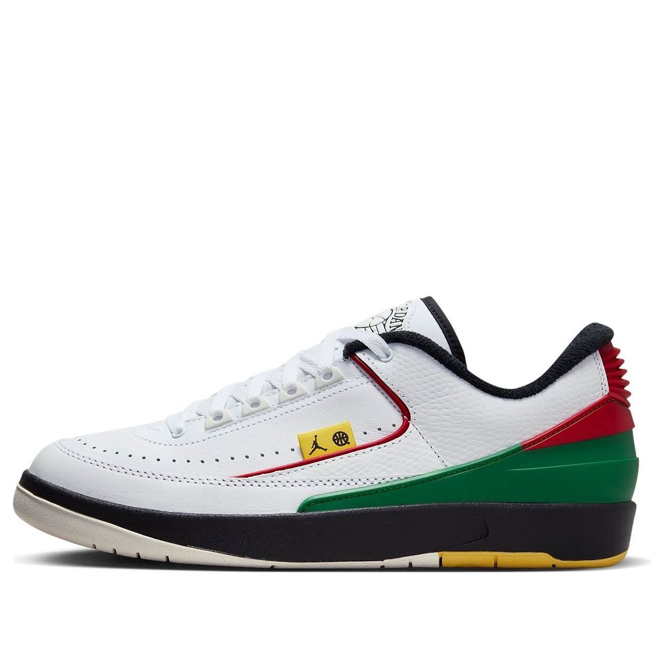 The Air Jordan 2 Low 'QUAI 54 2023' is a stylish and modern sneaker that is perfect for everyday wear. Its sleek silhouette and white colorway with accents of green and red make it a fashionable choice for any occasion. The sneaker is designed to provide maximum comfort and durability with its wear-resistant sole material. Inspired by the Quai 54 basketball tournament, this sneaker is a must-have for any Air Jordan fan. Whether you're running errands or going out for the night, the Air Jordan 2 Low 'QUAI 54 2023' is the perfect choice.