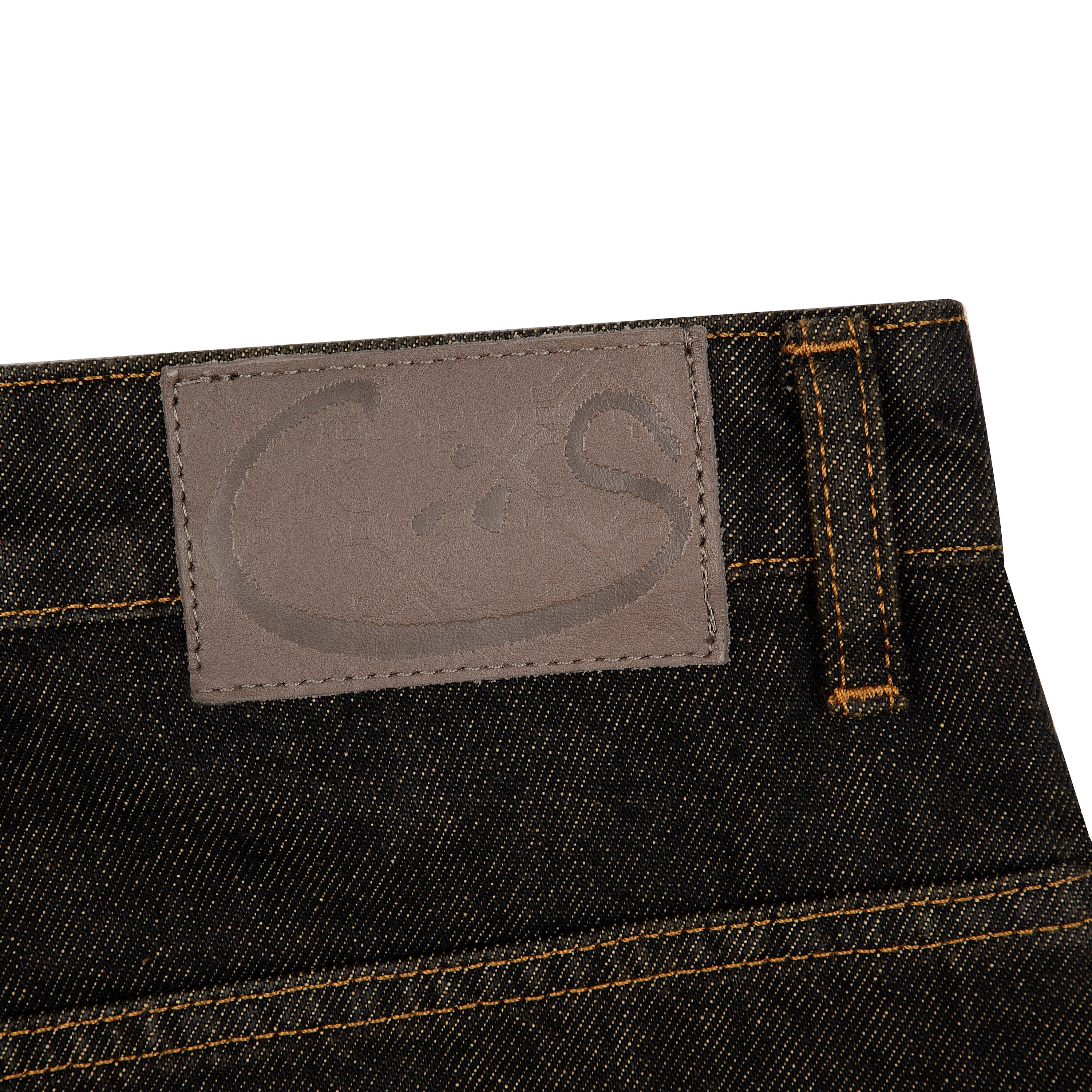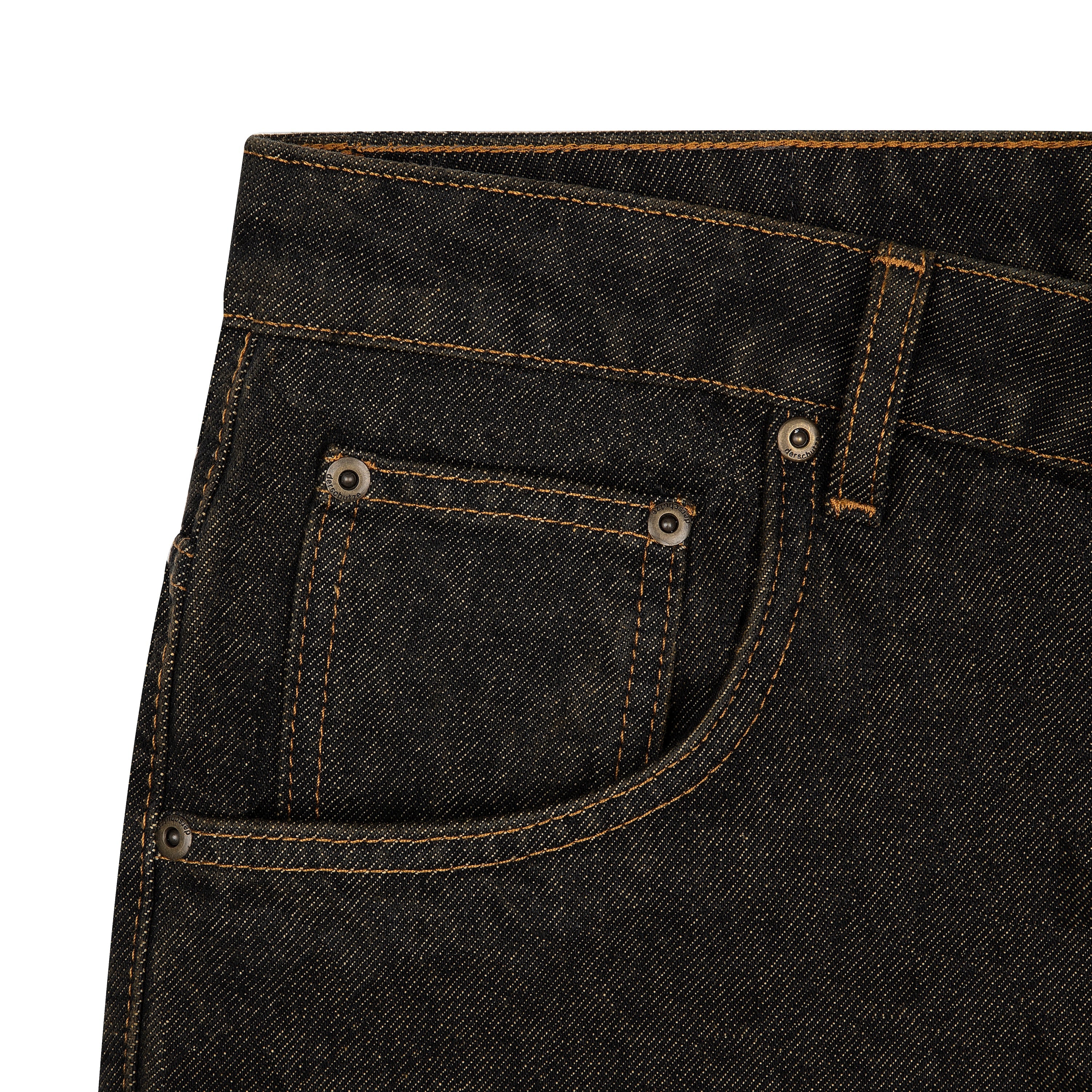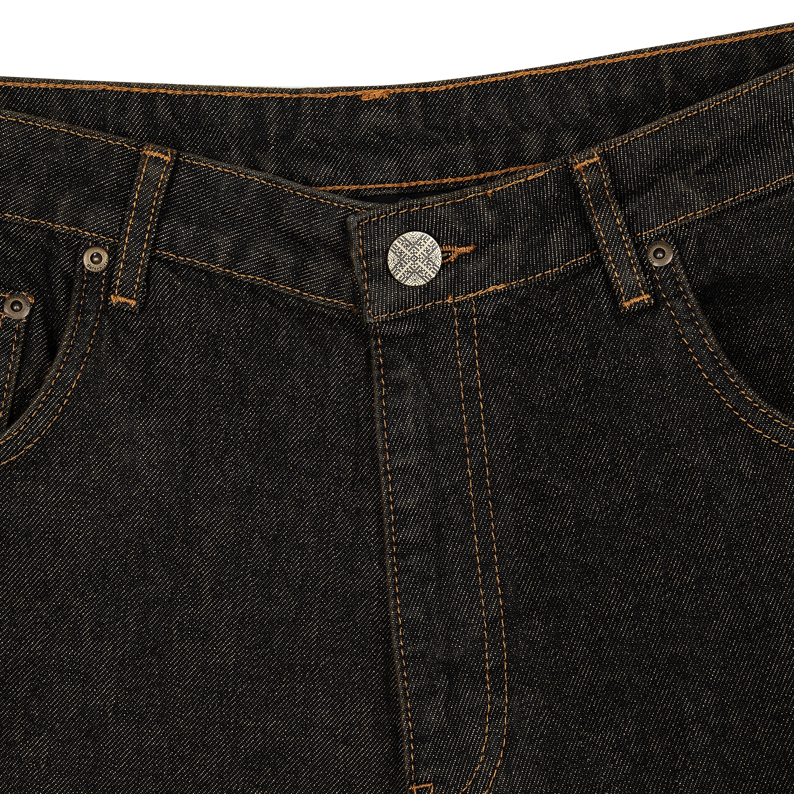 14,5oz denim / 100% cotton / inseam pieces / embroidery on back / debossed printed leather patch / custom button / black tinted washing effect / wash inside out / wash inside out / fits true to size