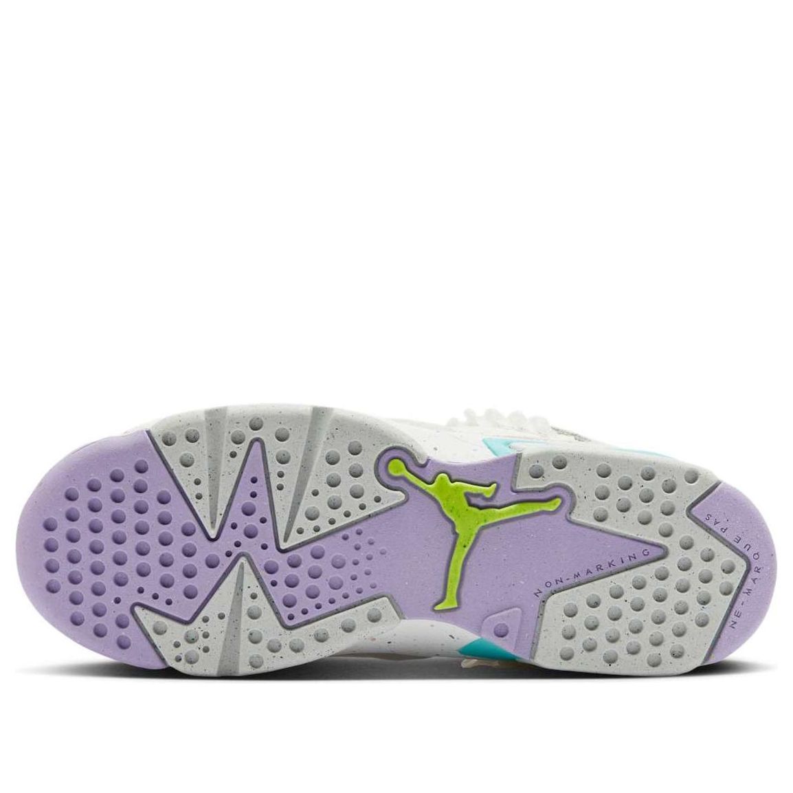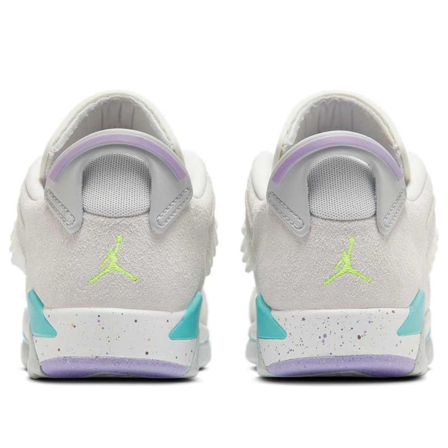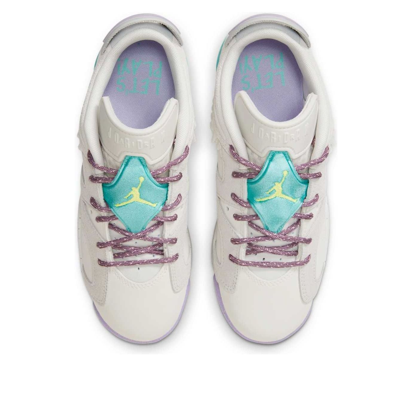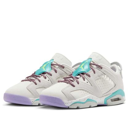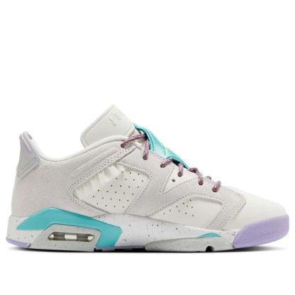 The Air Jordan 6 Low GS "Let's Play" is a vibrant and playful sneaker designed for kids. Featuring a white leather base with grey suede overlays, the shoe boasts a fun color palette with aqua and lilac accents. The rope-inspired laces and flecked soles add a rugged touch, making it perfect for both play and casual wear. This sneaker combines comfort and style, with a low-top design for easy movement and a cushioned midsole for all-day comfort.