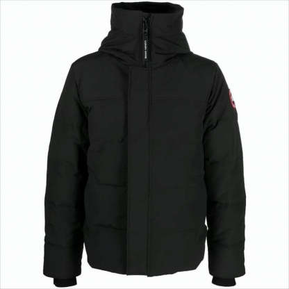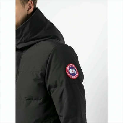 A padded black jacket from Canada Goose showcases a high collar and concealed front zipper for a sleek look. Horizontal stitching and a fitted silhouette ensure warmth, utilizing an 80% duck down and 20% duck feather fill. Practical features include ribbed cuffs and a hood, while the round patch logo on the upper sleeve signifies luxury and quality.