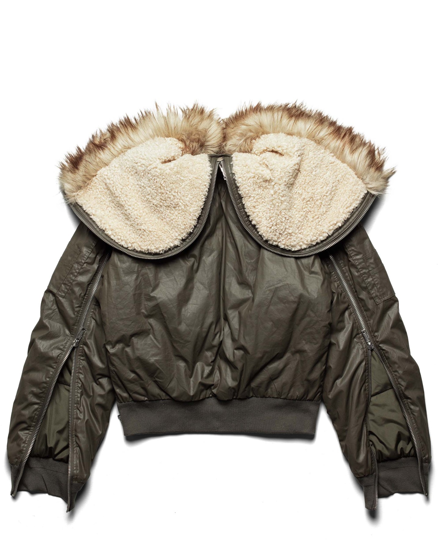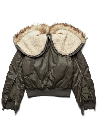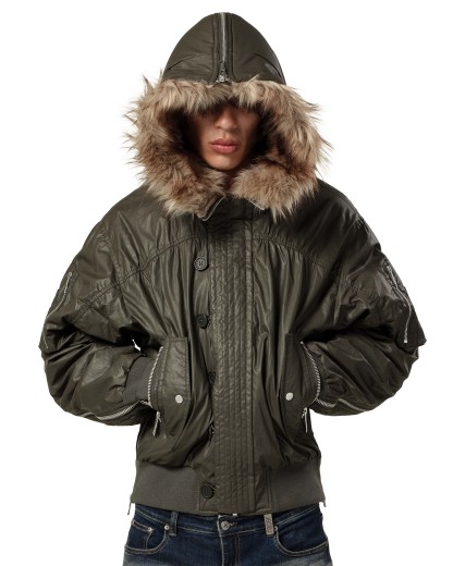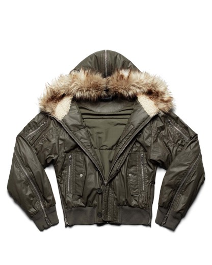 Fall/Winter 25 reworked edition of the bomber jacket in army green, crafted from waxed cotton with a split faux fur hood.